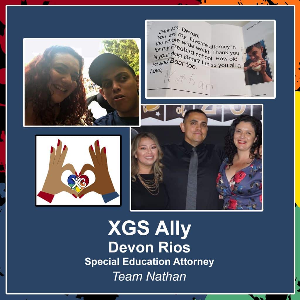 Devon is an award winning special education attorney and fierce advocate for the disabled community but her ability to connect with her clients and understand core needs is what highlights why she is an XGS ally and advocate. Nathan is the best judge of character and he truly feels Devon believes in his future. Devon represented our son during a time of crisis and trauma due to the educational system. Her willingness to think outside of the box while being open to Nathan’s challenging needs is a gift beyond measure