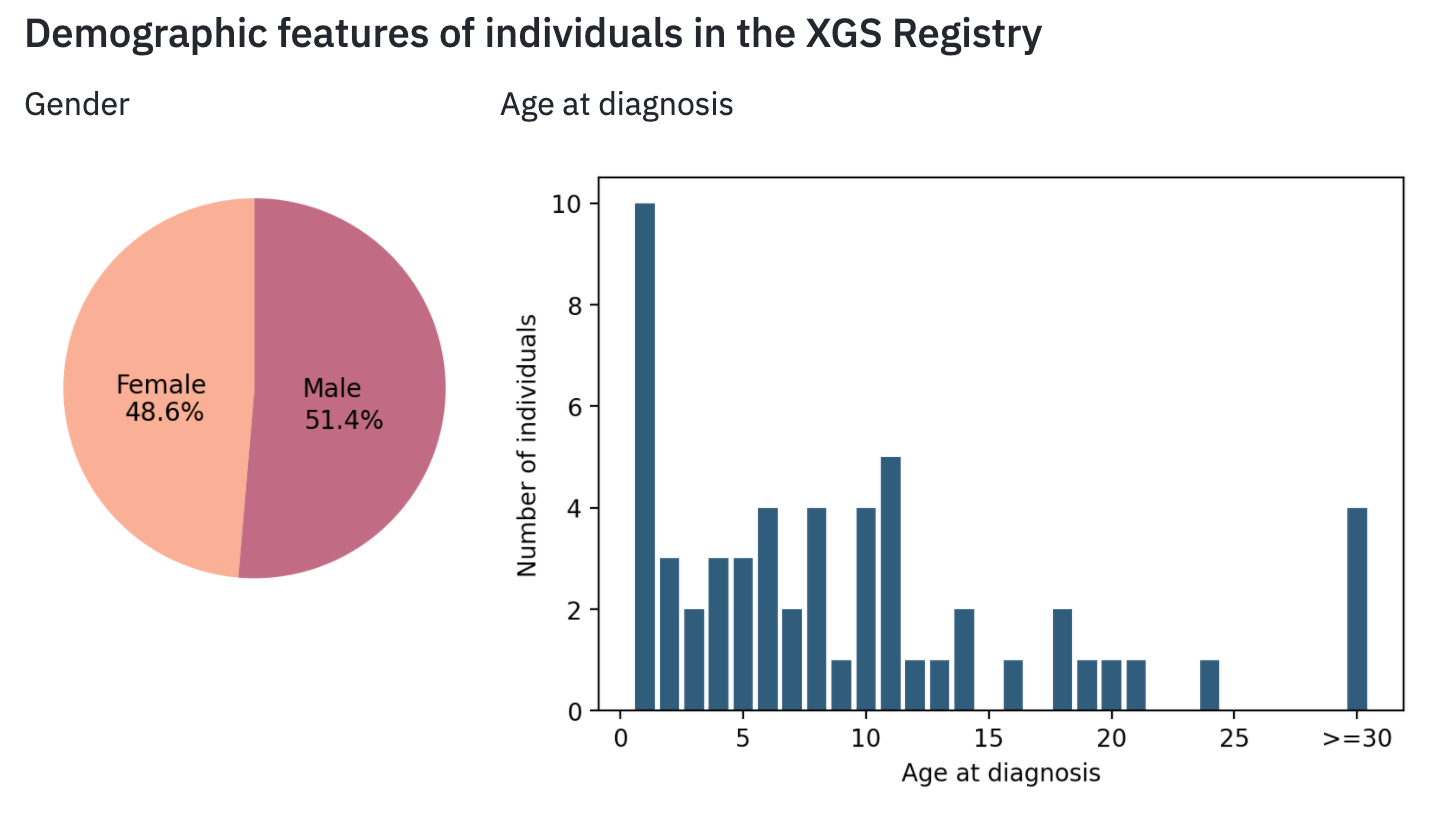 1: The XGS Registry continues to grow, and now of the more than 240 known families there are 65 who have filled out all the consents and sent detailed clinical records to the secure repository. Your participation in bolstering the Registry continues to be invaluable for all research studies. Thanks to Jianhong Hu for her tireless work here. As the Registry grows, it is admittedly somewhat cumbersome to work with, which is an inevitable aspect of the need for high levels of security. An HGSC Fellow He (Hurley) Li has now worked to introduce new technology for the Registry to make it easier to enter and fill out forms, while maintaining full security. He has built a Dashboard on top of the Registry to provide summary information. A screen shot with a glimpse from his work is below and we will fully launch in the coming months. THANK YOU TO THE XGS SOCIETY WHO JUST ANNOUNCED SUPPORT FOR HURLEY TO ADVANCE THIS WORK!