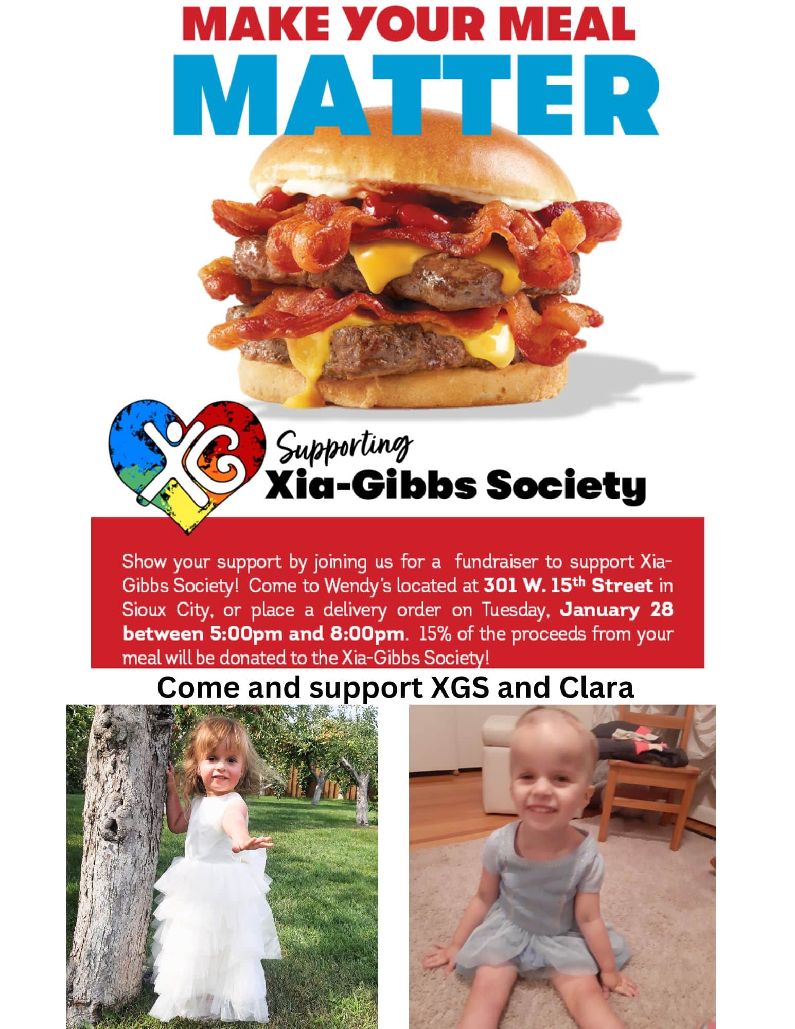 The event, called “Make Your Meal Matter,” invited the community to enjoy a meal at Wendy’s, with 15% of the proceeds from each purchase being donated to Clara’s cause. Thanks to Clara’s family’s passion and commitment to this cause, the event was a great success, raising much-needed funds for Xia-Gibbs Society and our project to fund research into Xia-Gibbs Syndrome.
