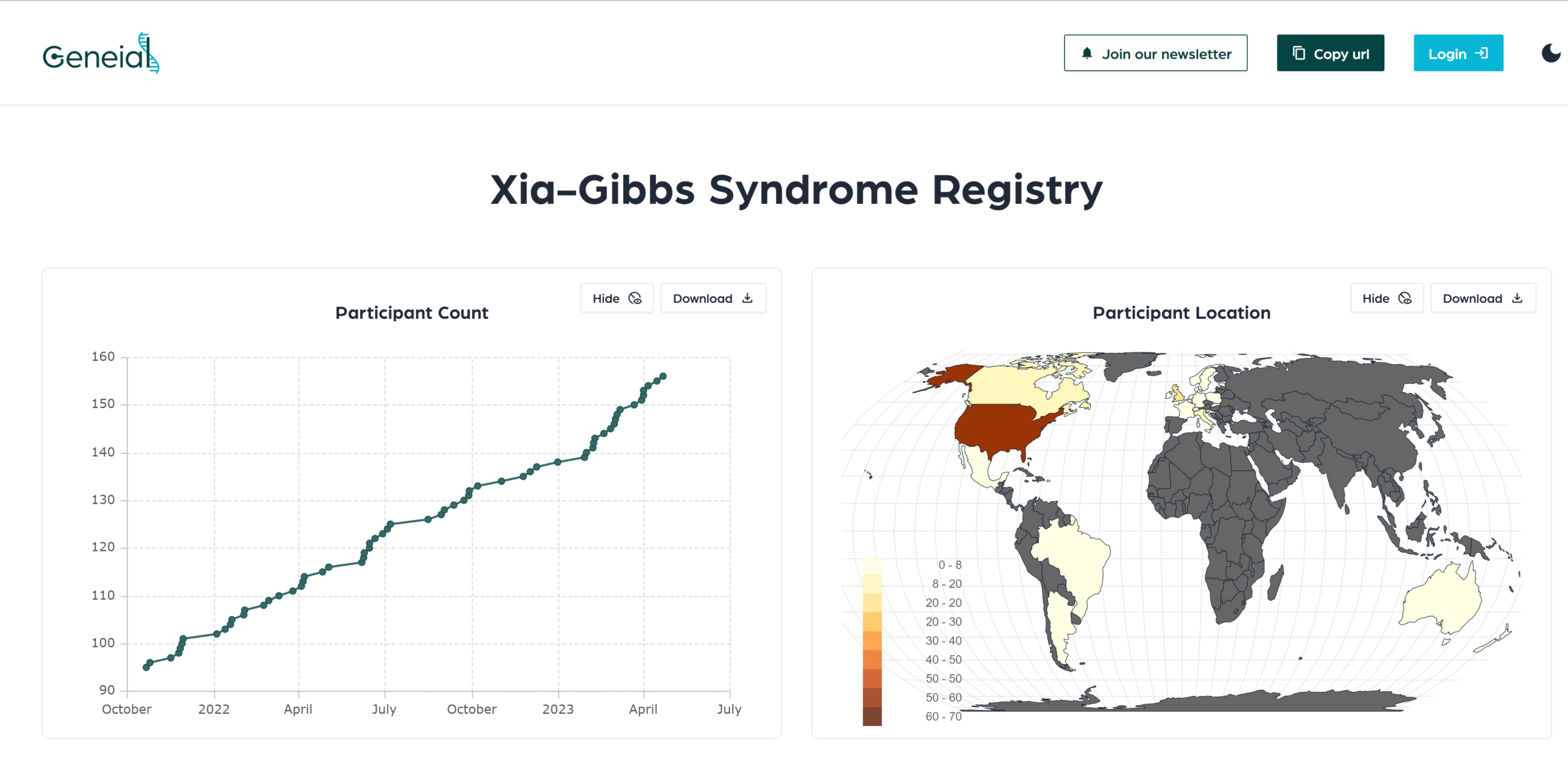 As part of Geneial’s ‘Phase One’ activities, the XGS Registry data were successfully migrated to the Geneial platform, Bridge, which supports data management, access control, and basic analysis. Within Bridge, a dashboard was established including a table browser supporting search and filtering of registry entries based on any registry field, genetic support data management, access control, and basic analysis. Charts of registry growth, participant location by country, and demographics (sex at birth, ethnicity, and age) are available at the dashboard. An AHDC1 protein map with case variant locations in conjugation with protein functional domains is also available at the dashboard.