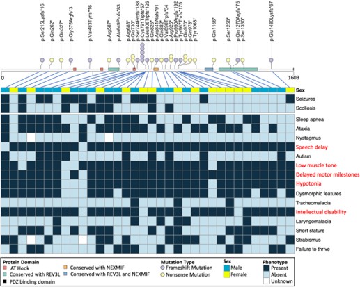This research reveals that whilst the clinical presentation of Xia-Gibbs syndrome is still evolving and shows variability, a core set of five ‘phenotypes’ (or sets of observable characteristics and symptoms) is already emerging. The core phenotypes, which occured in more than 80% of individuals, include: delayed motor milestones, speech delay, low muscle tone, intellectual disability, and hypotonia. An additional 12 features occurred more variably: seizures, scoliosis, sleep apnea, ataxia, nystagmus, autism, dysmorphic features, tracheomalacia, laryngomalacia, short stature, strabismus, and failure to thrive.